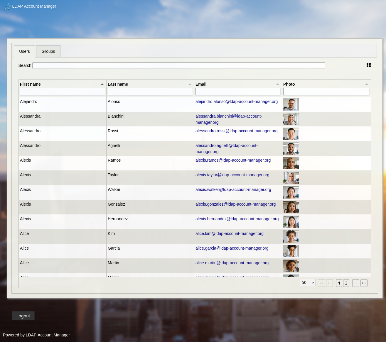 White pages allows your users to browse the company's directory of e.g. users and groups. This way they can find colleagues and their contact data like email and telephone number. The configuration is fully flexible. You could also allow to search for rooms, servers and other objects inside LDAP.